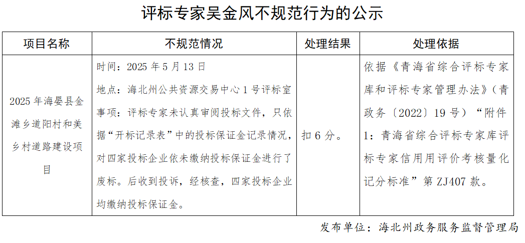 评标专家吴金风不规范行为的公示